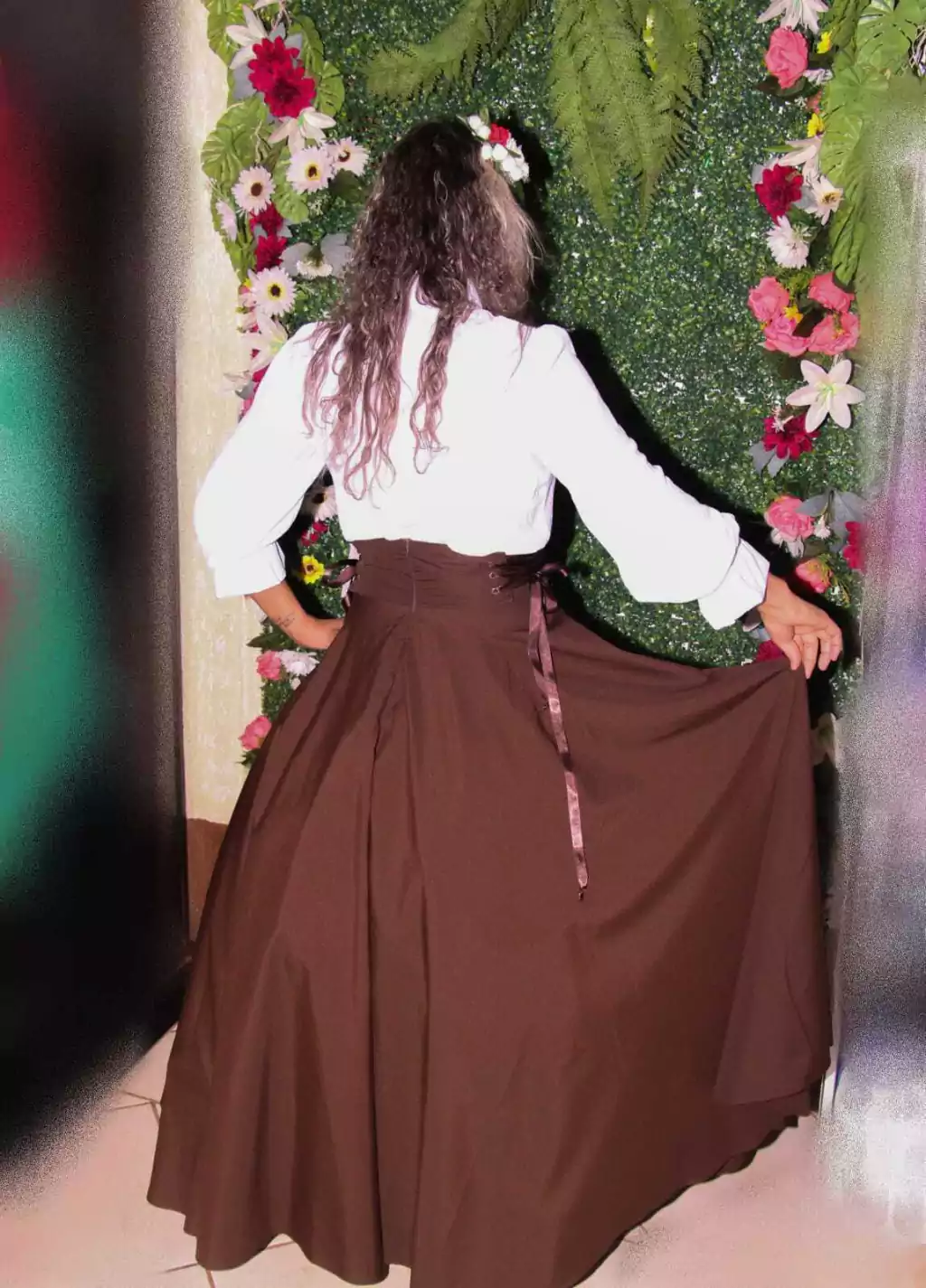 Conjunto saia godê com detalhes nas laterais de amarrações de fita de cetim, a qual permite ajustar ou alargar na cintura. E blusa branca manga longa com elástico no punho da manga, que permite usar manga longa ou puxar para cima no braço deixando do comprimento desejado. Blusa de tecido crepe 100 porcento poliester, com ótimo caimento, veste muito bem e tem os detalhes de babados na gola, deixando uma peça muito linda e elegante para a prenda.